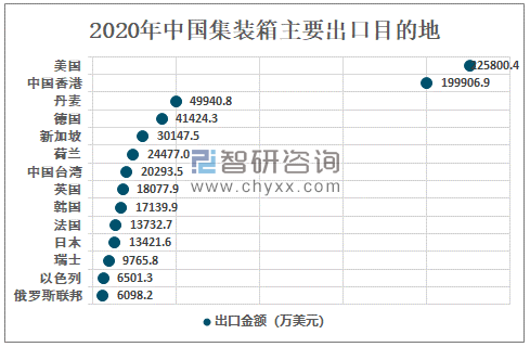 中国集装箱主要出口至美国、中国香港及丹麦等地,2020年中国集装箱共出口至美国125800.4万美元,占总出口金额的30.6%;出口至中国香港199906.9万美元,占总出口金额的27.1%。