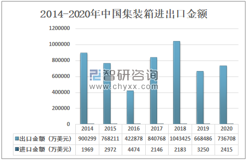 智研咨询发布的《2021-2027年中国集装箱行业市场全景评估及未来趋势预测报告》数据显示:2019年中国集装箱出口金额为668486万美元,进口金额为3250万美元;2020年中国集装箱出口金额为736708万美元,进口金额为2415万美元。