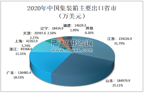 2020年中国集装箱出口金额TOP3地区依次为江苏省、山东省及广东省,出口金额分别为234226.9万美元、184979.9万美元、136485.4万美元,占总出口金额的比重分别为31.79%、25.11%、18.53%。