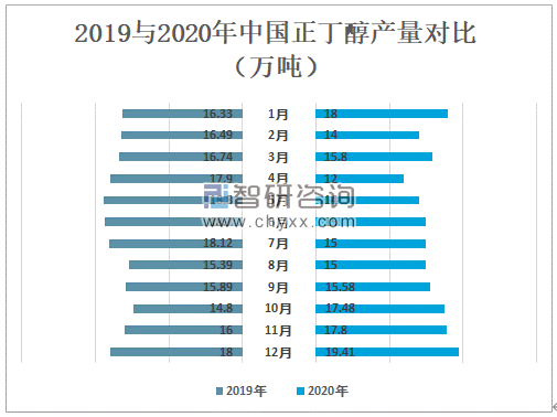 智研咨询发布的《2021-2027年中国正丁醇行业市场供需规模及投资前景预测报告》数据显示:从月度数据来看,2020年2-9月中国正丁醇产量均低于2019年同期,10月起中国正丁醇产量开始恢复增长,2020年12月中国正丁醇产量为19.41万吨,较2019年同期增加了1.4万吨。