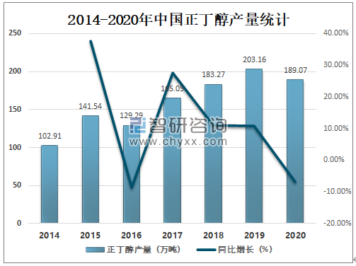 正丁醇在化学工程与工艺生产过程扮演着重要角色,是一种重要的化学化工有机原材料,具有非常广泛的作用。我国正丁醇的生产和起步价较晚,主要源于上个世纪50年代左右,自2017年开始中国正丁醇产量逐年增加,2019年中国正丁醇产量达203.16万吨,较2018年增加了19.89万吨,同比增长10.85%,2020年较2019年有所下滑,2020年中国正丁醇产量为189.07万吨,较2019年减少了14.09万吨,同比减少6.94%。