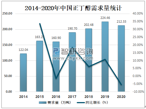 近年来,我国正丁醇主要消费领域在于化学工业以及医药工业。在医药工业方面,正丁醇主要用于生产抗生素、维生素等药物生产。目前,我国对正丁醇的消费量呈现出逐年递增的情况,2019年中国正丁醇需求量达224.46万吨,较2018年增加了21.97万吨,同比增长10.85%,2020年较2019年有所下滑,2020年中国正丁醇需求量为212.33万吨,较2019年减少了12.13万吨,同比减少5.40%。随着正丁醇下游产物的快速发展,我国正丁醇的生产量无法满足下游产品的生产需求,进口量呈现出递增趋势。