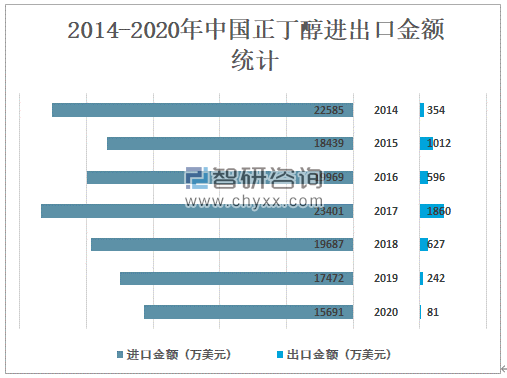 2020年中国正丁醇进口金额为15691万美元,较2019年减少了1781万美元;出口金额为81万美元,较2019年减少了161万美元。