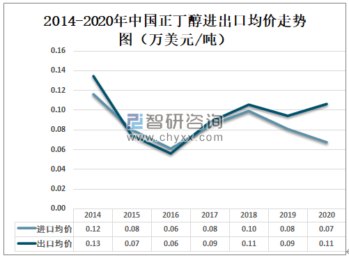 2020年中国正丁醇进口均价为0.07万美元/吨,较2019年减少了0.014万美元/吨;出口均价为0.11万美元/吨,较2019年增加了0.012万美元/吨。
