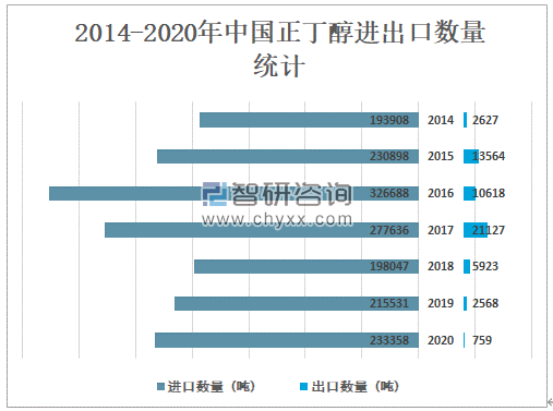 中国正丁醇进口数量明显大于出口数量,中国全球正丁醇重要的进口国之一。2020年中国正丁醇进口数量为233358吨,较2019年增加了17827吨;出口数量为759吨,较2019年减少了1809吨。