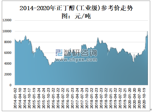 2014-2020年正丁醇(工业级)参考价走势图:元/吨