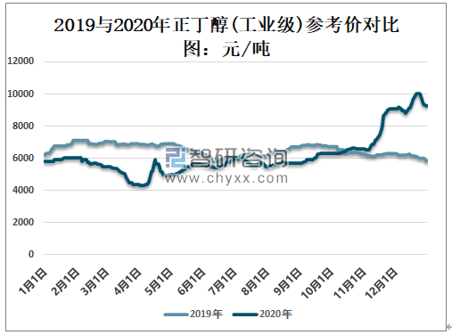 2019与2020年正丁醇(工业级)参考价对比图:元/吨