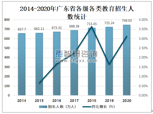 广东省教育水平位居中国前列,近年来广东省各级各类教育招生人数快速增长,2020年广东省各级各类教育(不含非学历培训、不含技工学校)招生人数达748.03万人,较2019年增加了22.79万人,同比增长3.14%。