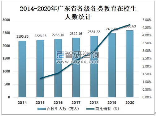 广东省各级各类教育在校生人数逐年增加,2020年广东省各级各类教育在校生人数达2600.63万人,较2019年增加了116.69万人,同比增长4.70%。