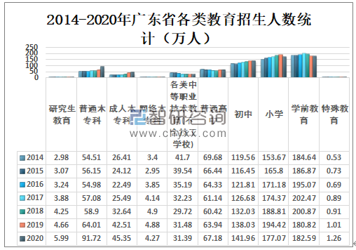 2020年广东省研究生教育招生人数为5.99万人,较2019年增加了1.33万人;普通本专科招生人数为91.72万人,较2019年增加了27.71万人;成人本专科招生人数为45.35万人,较2019年增加了2.84万人;网络本专科招生人数为4.27万人,较2019年减少了0.61万人;各类中等职业技术教育(不含技工学校)招生人数为31.39万人,较2019年减少了0.09万人;普通高中招生人数为67.18万人,较2019年增加了3.24万人;初中招生人数为141.96万人,较2019年增加了3.93万人;小学招生人数为177.07万人,较2019年减少了17.35万人;学前教育招生人数为182.59万人,较2019年增加了1.77万人;特殊教育招生人数为1.26万人,较2019年增加了0.25万人。