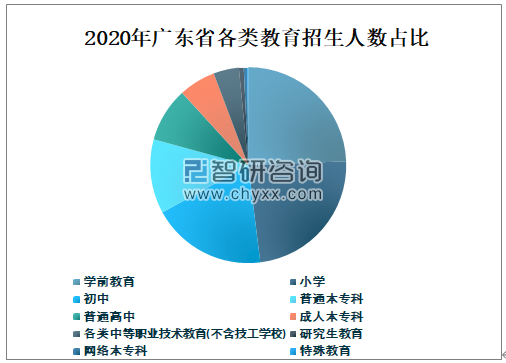 智研咨询发布的《2021-2027年中国教育产业发展动态及未来趋势预测报告》数据显示:2020年广东省学前教育、小学、初中、普通本专科、普通高中五类教育招生人数占广东省各类教育招生人数的88.3%,占比非常大,其中学前教育招生人数占广东省各类教育招生人数的24.4%,占比最大;小学招生人数占广东省各类教育招生人数的23.7%;初中招生人数占广东省各类教育招生人数的19.0%;普通本专科招生人数占广东省各类教育招生人数的12.3%;普通高中招生人数占广东省各类教育招生人数的9.0%。