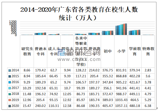 2020年广东省研究生教育在校生人数为15.47万人,较2019年增加了2.51万人;普通本专科在校生人数为240.02万人,较2019年增加了34.62万人;成人本专科在校生人数为110.31万人,较2019年增加了17.16万人;网络本专科在校生人数为12.58万人,较2019年减少了0.34万人;各类中等职业技术教育(不含技工学校)在校生人数为86.68万人,较2019年增加了0.71万人;普通高中在校生人数为190.35万人,较2019年增加了6.61万人;初中在校生人数为405.47万人,较2019年增加了16.44万人;小学在校生人数为1057.11万人,较2019年增加了23.68万人;学前教育在校生人数为480.18万人,较2019年增加了15.68万人;特殊教育在校生人数为6.38万人,较2019年增加了1.09万人。