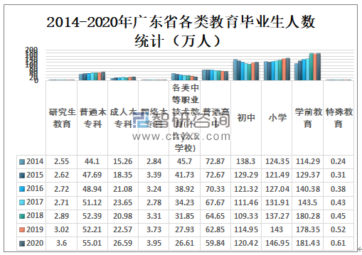 2020年广东省研究生教育毕业生人数为3.6万人,较2019年增加了0.58万人;普通本专科毕业生人数为55.01万人,较2019年增加了2.8万人;成人本专科毕业生人数为26.59万人,较2019年增加了4.02万人;网络本专科毕业生人数为3.95万人,较2019年增加了0.22万人;各类中等职业技术教育(不含技工学校)毕业生人数为26.61万人,较2019年减少了1.32万人;普通高中毕业生人数为59.84万人,较2019年减少了3.01万人;初中毕业生人数为120.42万人,较2019年增加了5.47万人;小学毕业生人数为146.95万人,较2019年增加了3.95万人;学前教育毕业生人数为181.43万人,较2019年增加了3.08万人;特殊教育毕业生人数为0.61万人,较2019年增加了0.09万人。