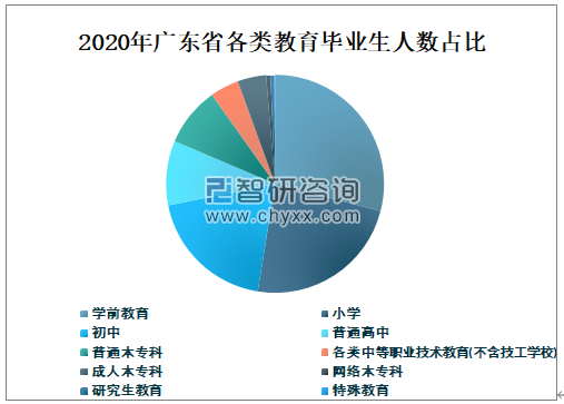 2020年广东省学前教育、小学、初中、普通高中、普通本专科五类教育毕业生人数占广东省各类教育毕业生人数的90.23%,占比非常大,其中学前教育毕业生人数占广东省各类教育毕业生人数的29.04%,占比最大;小学毕业生人数占广东省各类教育毕业生人数的23.52%;初中毕业生人数占广东省各类教育毕业生人数的19.28%;普通高中毕业生人数占广东省各类教育毕业生人数的9.58%;普通本专科毕业生人数占广东省各类教育毕业生人数的8.81%。