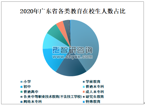 2020年广东省小学、学前教育、初中、普通本专科、普通高中五类教育在校生人数占广东省各类教育在校生人数的91.3%,占比非常大,其中小学在校生人数占广东省各类教育在校生人数的40.6%,占比最大;学前教育在校生人数占广东省各类教育在校生人数的18.5%;初中在校生人数占广东省各类教育在校生人数的15.6%;普通本专科在校生人数占广东省各类教育在校生人数的9.2%;普通高中在校生人数占广东省各类教育在校生人数的7.3%。