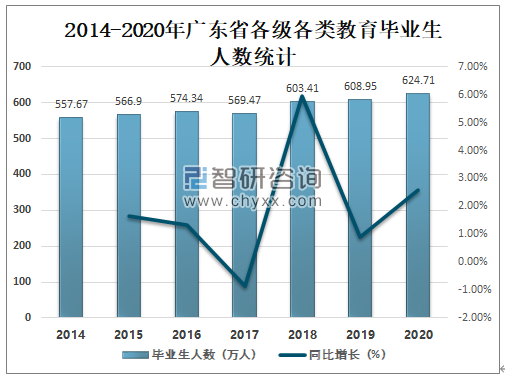总体来看广东省各级各类教育毕业生人数呈增长趋势,2020年广东省各级各类教育毕业生人数达624.71万人,较2019年增加了15.76万人,同比增长2.59%。