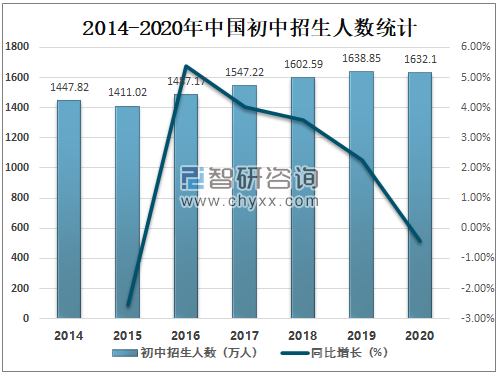 近年来中国初中招生人数逐年增加,2019年中国初中招生人数达1638.85万人,较2018年增加了36.26万人,同比增长2.26%,2020年较2019年有所下滑,2020年中国初中招生人数为1632.1万人,较2019年减少了6.75万人,同比减少0.41%。