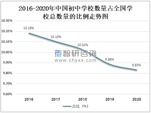 智研咨询发布的《2021-2027年中国民办中小学教育行业市场全景评估及未来趋势预测报告》数据显示:中国初中学校数量占全国学校总数量的比例逐年下滑,2020年中国初中学校数量占全国学校总数量的9.83%,较2016年的10.18%减少了0.35%。