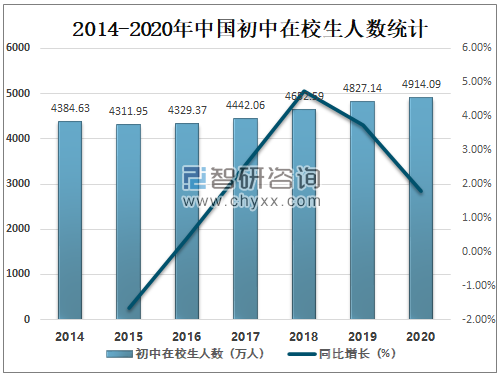 中国初中在校生人数快速增长,2020年中国初中在校生人数达4914.09万人,较2019年增加了86.95万人,同比增长1.80%。