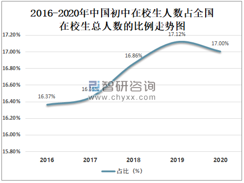 自2017年起中国初中在校生人数占全国在校生总人数的比例逐年攀升,2019年中国初中在校生人数占全国在校生总人数的17.12%,较2018年增长了0.26%,2020年较2019年有所下滑,2020年中国初中在校生人数占全国在校生总人数的17.00%,较2019年减少了0.11%。