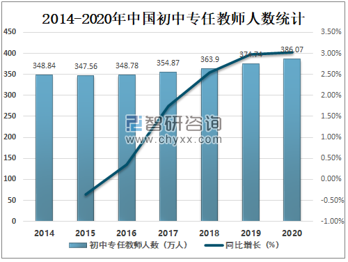 在师资队伍建设方面,自2016年起中国初中专任教师人数逐年增加,2020年中国初中专任教师人数达386.07万人,较2019年增加了11.33万人,同比增长3.02%。