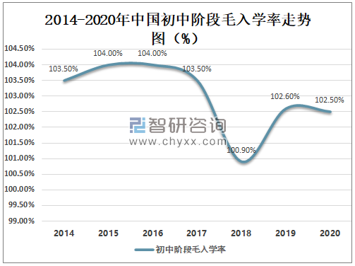 总体来看中国初中阶段毛入学率走势呈下滑趋势,2020年中国初中阶段毛入学率为102.50%,较2014年的103.50%减少了1%。