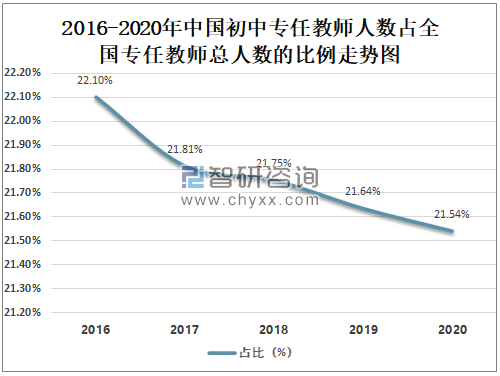 中国初中专任教师人数占全国专任教师总人数的比例逐年下滑,2020年中国初中专任教师人数占全国专任教师总人数的21.54%,较2014年的22.10%减少了0.56%。