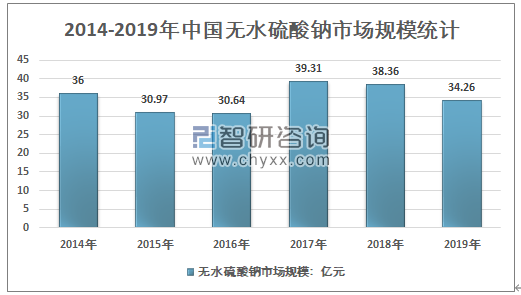 受产品需求总量以及价格变动的影响,我国无水硫酸钠产品需求市场规模呈现出较大的波动性。2018年我国无水硫酸钠产品市场规模为38.36亿元,2019年我国无水硫酸钠产品市场规模为34.26亿元。
