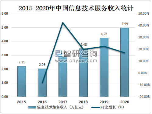 信息技术的发展和普及应用,使人们生产生活的自动化、智能化需求有了充分的保障,随着人们人性化服务需要水平的不断提高,信息技术的应用领域越来越广泛,近年来信息技术业是成为现代服务业的重要组成部分,2020年中国信息技术服务收入达4.99万亿元,较2019年增加了0.73万亿元,同比增长17.13%。