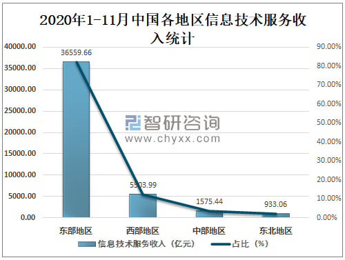 中国信息技术服务主要集中在东部地区,2020年1-11月中国东部地区信息技术服务收入为36559.66亿元,占全国信息技术服务总收入的82.02%,占比最大;西部地区信息技术服务收入为5503.99亿元,占全国信息技术服务总收入的12.35%;中部地区信息技术服务收入为1575.44亿元,占全国信息技术服务总收入的3.53%;东北地区信息技术服务收入为933.06亿元,占全国信息技术服务总收入的2.09%。