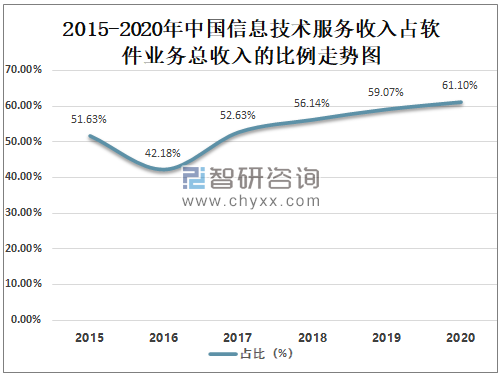 自2017年起中国信息技术服务收入占软件业务总收入的比例逐年攀升,并长期占据中国软件业务总收入五成以上的比例,2020年中国信息技术服务收入占软件业务总收入的61.10%,较2019年增长了2.03%。