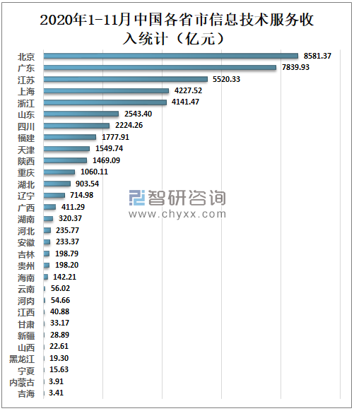 2020年1-11月北京信息技术服务收入为8581.37亿元,全国排名第一;广东信息技术服务收入为7839.93亿元,全国排名第二;江苏信息技术服务收入为5520.33亿元,全国排名第三。