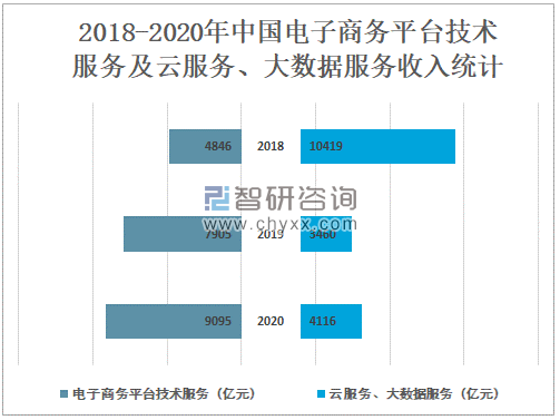 智研咨询发布的《2021-2027年中国信息技术行业市场运行格局及投资前景分析报告》数据显示:2020年中国电子商务平台技术服务收入为9095亿元,较2019年增加了1190亿元;云服务、大数据服务收入为4116亿元,较2019年增加了656亿元。