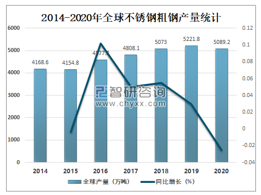 不锈钢的应用领域非常广泛,广泛应用于汽车、航空、机械、建筑、家电、厨房用具等多个领域。随着下游产业的高速发展,带动全球不锈钢市场快速发展。近年来全球不锈钢的产量逐年增加,2019年全球不锈钢粗钢产量达5221.8万吨,较2018年增加了148.8万吨,同比增长2.93%,2020年受新冠肺炎疫情影响,全球不锈钢粗钢产量有所下滑,2020年全球不锈钢粗钢产量为5089.2万吨,较2019年减少了132.6万吨,同比减少2.54%。