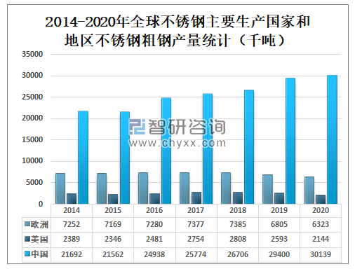 全球不锈钢产地主要集中在中国、美国和欧洲等地区,2020年欧洲不锈钢粗钢产量为6323千吨,较2019年减少了482千吨;美国不锈钢粗钢产量为2144千吨,较2019年减少了449千吨;中国不锈钢粗钢产量为30139千吨,较2019年增加了739千吨。