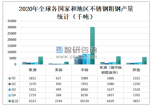 2020年全球不锈钢粗钢产量为50892千吨,其中欧洲不锈钢粗钢产量为6323千吨,欧洲一季度完成1812千吨,二季度完成1370千吨,三季度完成1421千吨,四季度完成1719千吨;美国不锈钢粗钢产量为2144千吨,美国一季度完成627千吨,二季度完成450千吨,三季度完成499千吨,四季度完成568千吨;中国不锈钢粗钢产量为30139千吨,中国一季度完成5989千吨,二季度完成7455千吨,三季度完成8460千吨,四季度完成8236千吨;亚洲(除中国和韩国外)不锈钢粗钢产量为6429千吨,亚洲(除中国和韩国外)一季度完成1886千吨,二季度完成1080千吨,三季度完成1627千吨,四季度完成1837千吨;其他地区不锈钢粗钢产量为5857千吨,其他地区一季度完成1322千吨,二季度完成1250千吨,三季度完成1520千吨,四季度完成1765千吨。