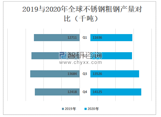 智研咨询发布的《2021-2027年中国不锈钢行业市场深度评估及市场发展策略报告》数据显示:从季度数据来看,受新冠肺炎疫情影响,2020年一季度和二季度全球不锈钢粗钢产量明显低于2019年同期,2020年三季度较二季度有所回升,但依然低于2019年同期,2020年四季度开始恢复增长,且高于2019年同期。2020年四季度全球不锈钢粗钢产量为14125千吨,较2019年同期增加了1707千吨。