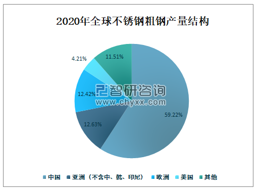 2020年中国不锈钢粗钢产量占全球不锈钢粗钢总产量的59.22%,占比最大;亚洲(不含中、韩、印尼)不锈钢粗钢产量占全球不锈钢粗钢总产量的12.63%;欧洲不锈钢粗钢产量占全球不锈钢粗钢总产量的12.42%;美国不锈钢粗钢产量占全球不锈钢粗钢总产量的4.21%;其他不锈钢粗钢产量占全球不锈钢粗钢总产量的11.51%。