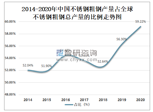 总体来看中国不锈钢粗钢产量占全球不锈钢粗钢总产量的比例呈增长趋势,2020年中国不锈钢粗钢产量占全球不锈钢粗钢总产量的59.22%,较2014年的52.04%增长了7.18%。
