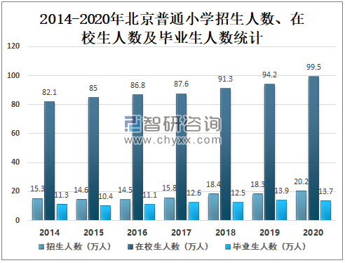 北京是全国教育最发达的地区之一。基础教育方面,2020年北京普通小学招生人数达20.2万人,较2019年增加了1.9万人;在校生人数达99.5万人,较2019年增加了5.3万人;毕业生人数为13.7万人,较2019年减少了0.2万人。
