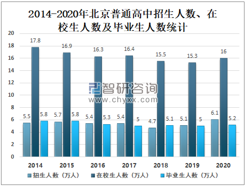 普通高中教育方面,2020年北京普通高中招生人数达6.1万人,较2019年增加了1万人;在校生人数达16万人,较2019年增加了0.7万人;毕业生人数达5.2万人,较2019年增加了0.2万人。