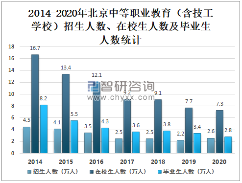 中等职业教育方面,2020年北京中等职业教育(含技工学校)招生人数为2.6万人,较2019年增加了0.4万人;在校生人数为7.3万人,较2019年减少了0.4万人;毕业生人数为2.8万人,较2019年减少了0.6万人。