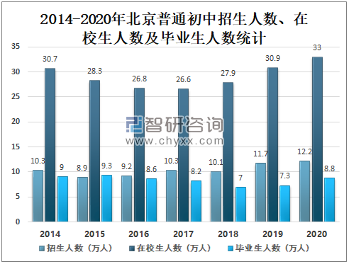 智研咨询发布的《2021-2027年中国教育产业发展动态及未来趋势预测报告》数据显示:2020年北京普通初中招生人数达12.2万人,较2019年增加了0.5万人;在校生人数达33万人,较2019年增加了2.1万人;毕业生人数达8.8万人,较2019年增加了1.5万人。