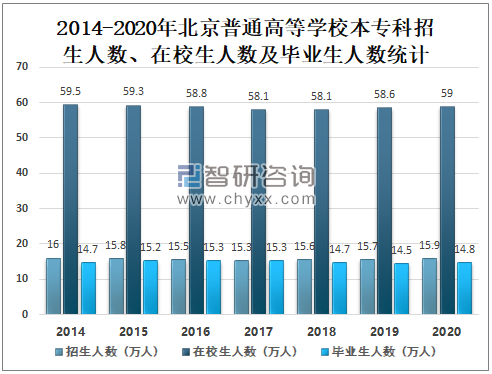 北京是全国高等院校的中心,聚集了全国数量最多的重点大学。其中包括北京大学、清华大学、中国人民大学、北京师范大学等全国最为著名的学府。2020年北京普通高等学校本专科招生人数达15.9万人,较2019年增加了0.2万人;在校生人数达59万人,较2019年增加了0.4万人;毕业生人数达14.8万人,较2019年增加了0.3万人。