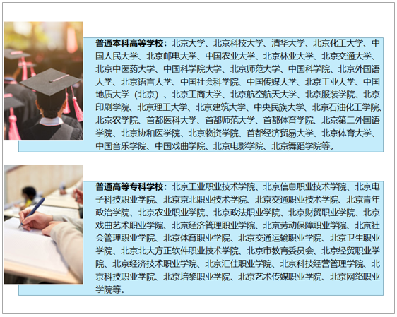北京普通本科高等学校主要有北京大学、清华大学、北京科技大学、北京化工大学、中国人民大学、北京邮电大学、中国农业大学、北京交通大学、北京林业大学、中国科学院大学、北京中医药大学、中国科学院、北京师范大学、中国社会科学院大学、北京外国语大学等。普通高等专科学校主要有北京工业职业技术学院、北京信息职业技术学院、北京电子科技职业学院、北京京北职业技术学院、北京交通职业技术学院、北京青年政治学院、北京农业职业学院、北京政法职业学院、北京财贸职业学院、北京戏曲艺术职业学院等。