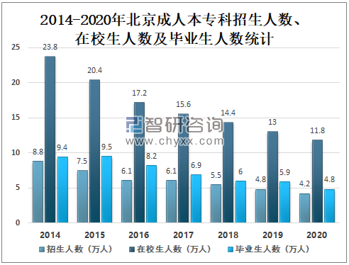 2020年北京成人本专科招生人数为4.2万人,较2019年减少了0.6万人;在校生人数为11.8万人,较2019年减少了1.2万人;毕业生人数为4.8万人,较2019年减少了1.1万人。
