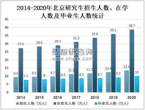 2020年北京研究生招生人数达13.4万人,较2019年增加了1万人;在校生人数达38.7万人,较2019年增加了2.6万人;毕业生人数达10万人,较2019年增加了0.8万人。