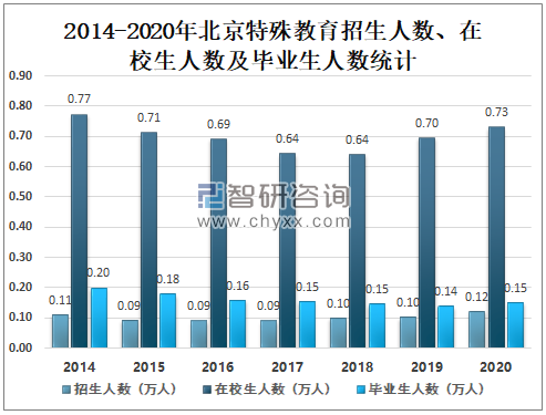 特殊教育方面,2020年北京特殊教育招生人数达0.12万人,较2019年增加了0.02万人;在校生人数达0.73万人,较2019年增加了0.03万人;毕业生人数达0.15万人,较2019年增加了0.01万人。