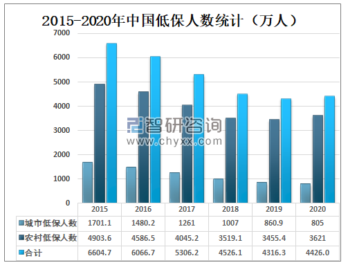 低保指因家庭成员存在重度残疾或疾病丧失劳动力,享受最低生活保障补助的家庭。其住房或收入明显低于当地低保标准的居(村)民。城市低保是在城市已经建立了国有企业下岗职工基本生活保障、失业保险和城市居民最低生活保障等“三条保障线”制度的基础上,建立实行最低生活保障的制度。2020年中国低保人数达4426万人,较2019年增加了109.7万人,其中城市低保人数为805万人,较2019年减少了55.9万人,农村低保人数为3621万人,较2019年增加了165.6。