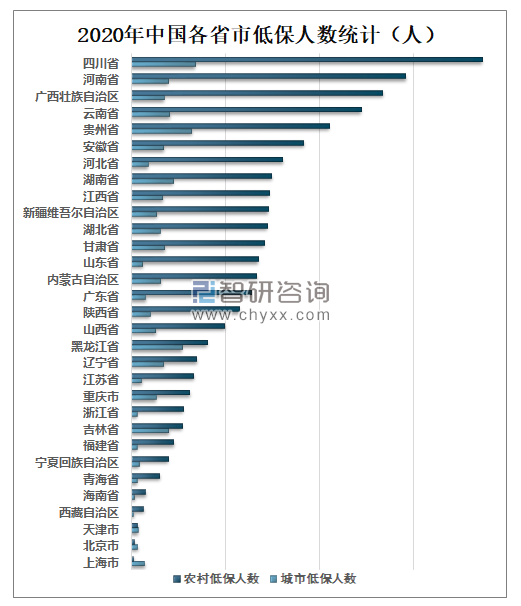 2020年四川省城市低保人数为679295人,全国排名第一;贵州省城市低保人数为644431人,全国排名第二;黑龙江省城市低保人数为544418人,全国排名第三。四川省农村低保人数为3737354人,全国排名第一;河南省农村低保人数为2924585人,全国排名第二;广西壮族自治区农村低保人数为2679544人,全国排名第三。